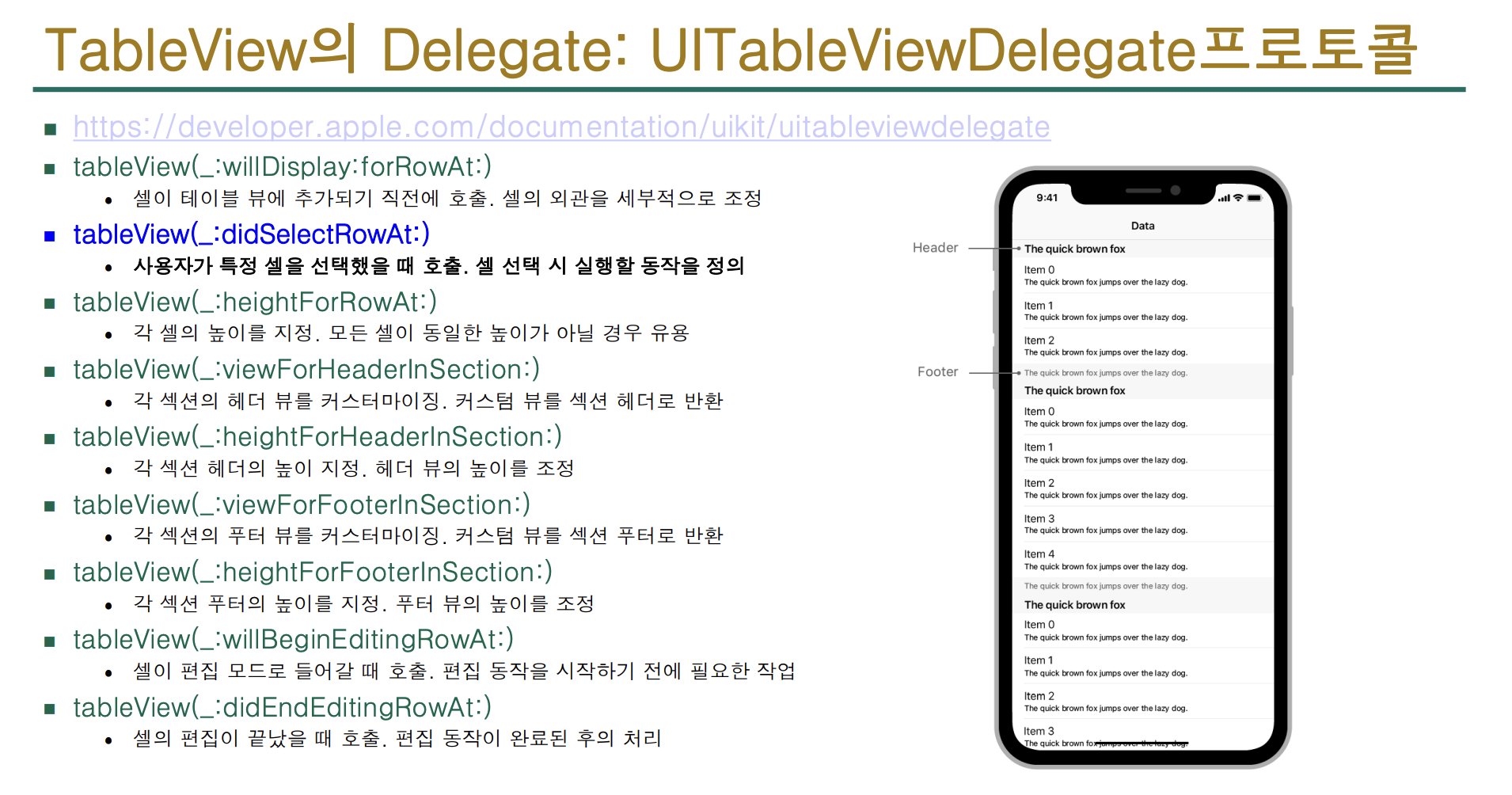 이 프로토콜의 메서드들은 사용자의 상호작용이나 특정 시점에 자동으로 호출되어 동작을 정의한다.