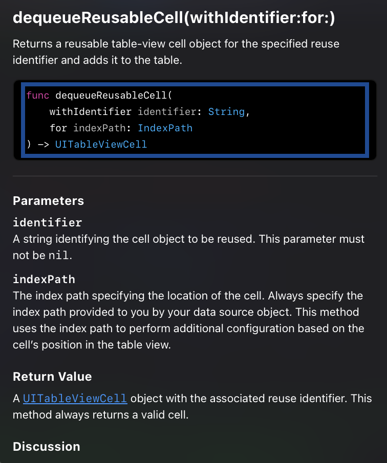 | indexPath.description | 전체 IndexPath를 [section, row] 형태로 문자열로 출력 |