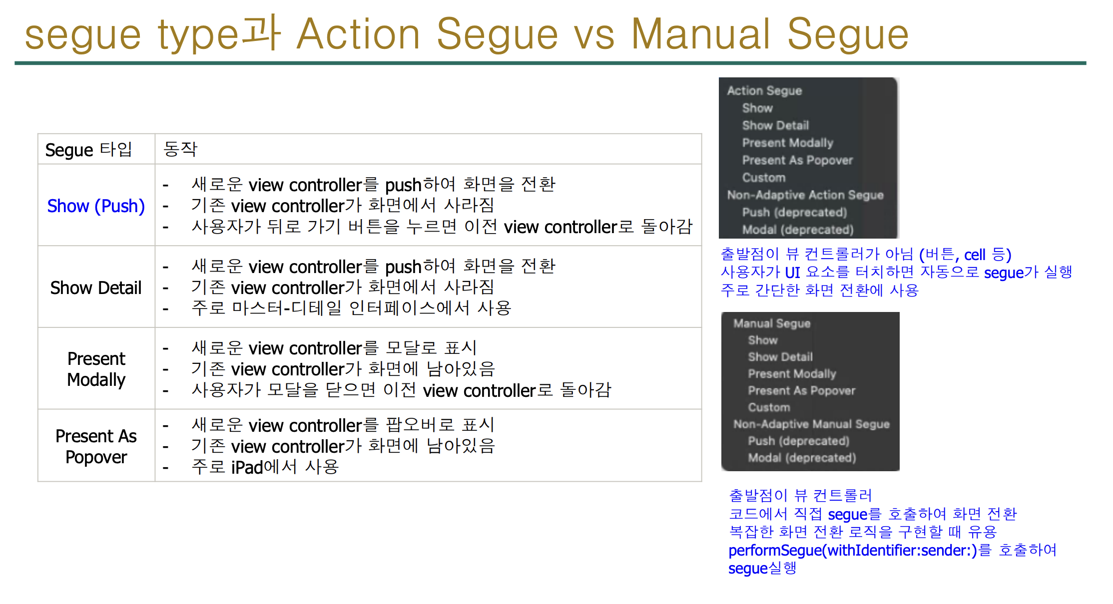 필요한 시점에 코드로 performSegue(withIdentifier:sender:)를 호출해 실행합니다. - 조건문, 인증, 데이터 확인 등 복잡한 로직에 따라 화면을 전환할 때 유용합니다.