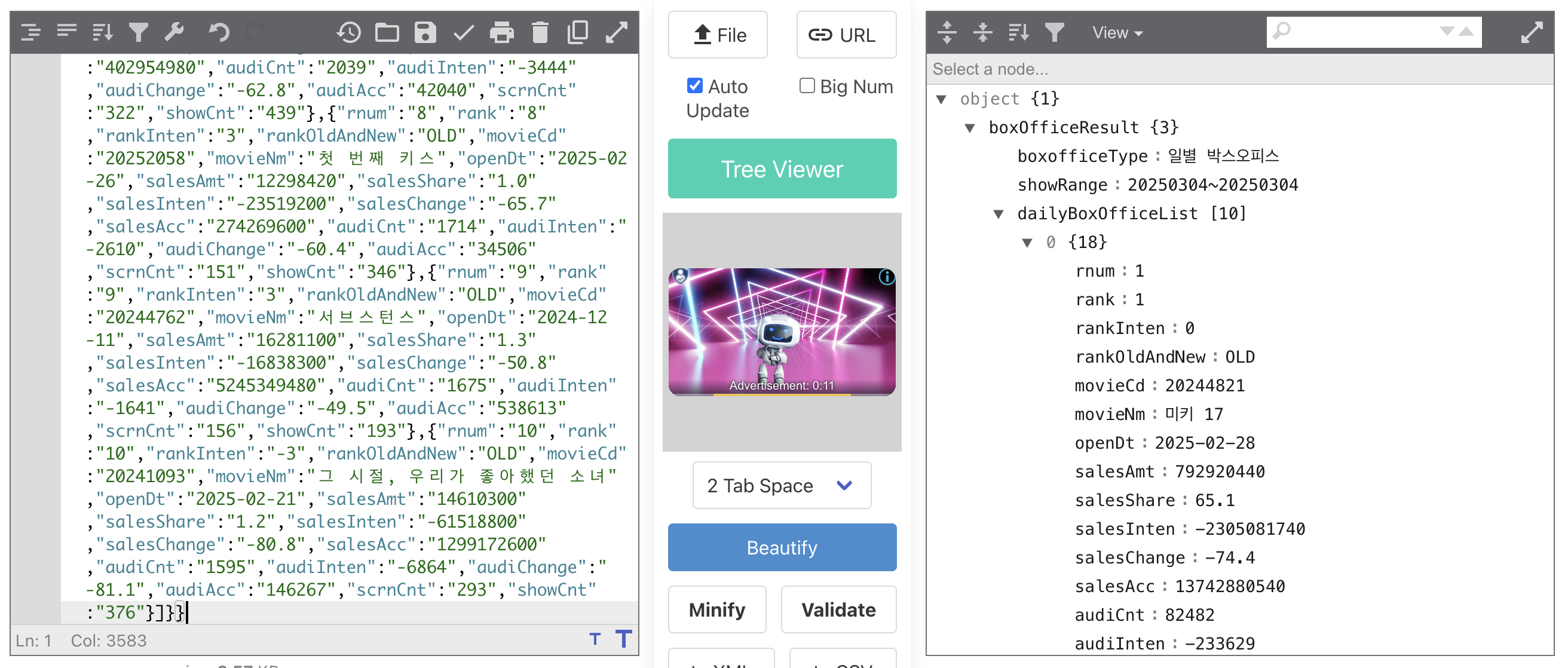 {"boxOfficeResult":{"boxofficeType":"일별 박스오피스","showRange":"20250304~20250304","dailyBoxOfficeList":[{"rnum":"1","rank":"1","rankInten":"0","rankOldAndNew":"OLD","movieCd":"20244821","movieNm":"미키 17","openDt":"2025-02-28","salesAmt":"792920440","salesShare":"65.1","salesInten":"-2305081740","salesChange":"-74.4","salesAcc":"13742880540","audiCnt":"82482","audiInten":"-233629","audiChange":"-73.9","audiAcc":"1385475","scrnCnt":"1882","showCnt":"6935"},{"rnum":"2","rank":"2","rankInten":"1","rankOldAndNew":"OLD","movieCd":"20240614","movieNm":"퇴마록","openDt":"2025-02-21","salesAmt":"74486380","salesShare":"6.1","salesInten":"-197541800","salesChange":"-72.6","salesAcc":"2959023580","audiCnt":"7991","audiInten":"-20124","audiChange":"-71.6","audiAcc":"309396","scrnCnt":"806","showCnt":"1383"},{"rnum":"3","rank":"3","rankInten":"-1","rankOldAndNew":"OLD","movieCd":"20242404","movieNm":"캡틴 아메리카: 브레이브 뉴 월드","openDt":"2025-02-12","salesAmt":"66367060","salesShare":"5.5","salesInten":"-244383040","salesChange":"-78.6","salesAcc":"15767989046","audiCnt":"7212","audiInten":"-25350","audiChange":"-77.9","audiAcc":"1591389","scrnCnt":"598","showCnt":"1317"},{"rnum":"4","rank":"4","rankInten":"1","rankOldAndNew":"OLD","movieCd":"20252719","movieNm":"힘내라 대한민국","openDt":"2025-02-27","salesAmt":"40805000","salesShare":"3.4","salesInten":"-60620600","salesChange":"-59.8","salesAcc":"353578840","audiCnt":"4614","audiInten":"-6167","audiChange":"-57.2","audiAcc":"37618","scrnCnt":"105","showCnt":"208"},{"rnum":"5","rank":"5","rankInten":"-1","rankOldAndNew":"OLD","movieCd":"20234689","movieNm":"괜찮아 괜찮아 괜찮아! ","openDt":"2025-02-26","salesAmt":"37355100","salesShare":"3.1","salesInten":"-60896620","salesChange":"-62","salesAcc":"628767400","audiCnt":"4326","audiInten":"-6470","audiChange":"-59.9","audiAcc":"71473","scrnCnt":"483","showCnt":"729"},{"rnum":"6","rank":"6","rankInten":"0","rankOldAndNew":"NEW","movieCd":"20252975","movieNm":"울프맨","openDt":"2025-03-05","salesAmt":"21140000","salesShare":"1.7","salesInten":"21140000","salesChange":"100","salesAcc":"21140000","audiCnt":"3020","audiInten":"3020","audiChange":"100","audiAcc":"3020","scrnCnt":"17","showCnt":"17"},{"rnum":"7","rank":"7","rankInten":"2","rankOldAndNew":"OLD","movieCd":"20240147","movieNm":"컴플리트 언노운","openDt":"2025-02-26","salesAmt":"19319960","salesShare":"1.6","salesInten":"-36043010","salesChange":"-65.1","salesAcc":"402954980","audiCnt":"2039","audiInten":"-3444","audiChange":"-62.8","audiAcc":"42040","scrnCnt":"322","showCnt":"439"},{"rnum":"8","rank":"8","rankInten":"3","rankOldAndNew":"OLD","movieCd":"20252058","movieNm":"첫 번째 키스","openDt":"2025-02-26","salesAmt":"12298420","salesShare":"1.0","salesInten":"-23519200","salesChange":"-65.7","salesAcc":"274269600","audiCnt":"1714","audiInten":"-2610","audiChange":"-60.4","audiAcc":"34506","scrnCnt":"151","showCnt":"346"},{"rnum":"9","rank":"9","rankInten":"3","rankOldAndNew":"OLD","movieCd":"20244762","movieNm":"서브스턴스","openDt":"2024-12-11","salesAmt":"16281100","salesShare":"1.3","salesInten":"-16838300","salesChange":"-50.8","salesAcc":"5245349480","audiCnt":"1675","audiInten":"-1641","audiChange":"-49.5","audiAcc":"538613","scrnCnt":"156","showCnt":"193"},{"rnum":"10","rank":"10","rankInten":"-3","rankOldAndNew":"OLD","movieCd":"20241093","movieNm":"그 시절, 우리가 좋아했던 소녀","openDt":"2025-02-21","salesAmt":"14610300","salesShare":"1.2","salesInten":"-61518800","salesChange":"-80.8","salesAcc":"1299172600","audiCnt":"1595","audiInten":"-6864","audiChange":"-81.1","audiAcc":"146267","scrnCnt":"293","showCnt":"376"}]}}