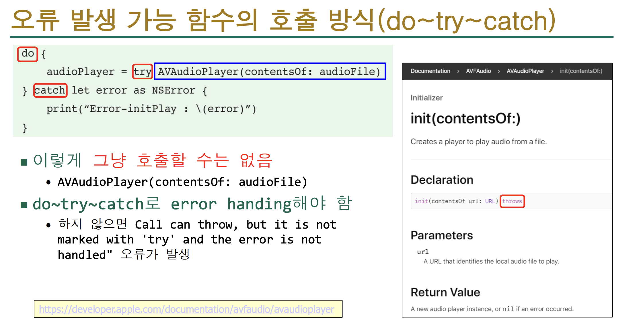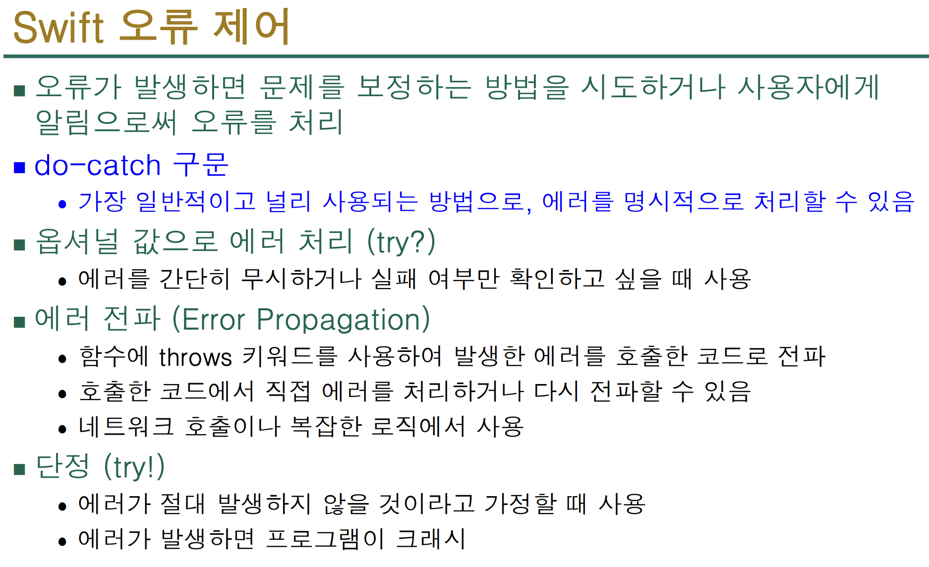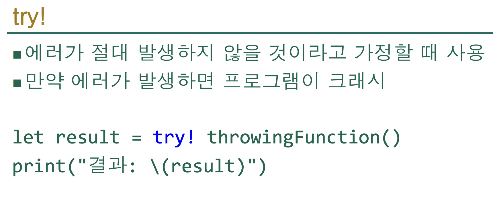 - 아니면 try! 또는 try? 로 처리 가능 (하지만 안전성 주의)